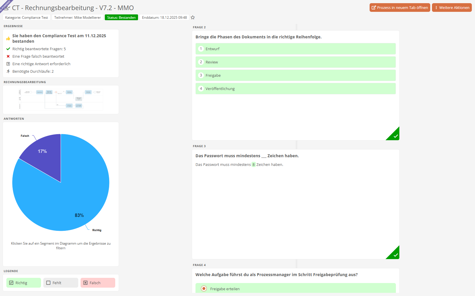 Erst wenn der Teilnehmer den Compliance Test bestanden hat, gelten die relevanten Inhalte des Objekts als erfolgreich zur Kenntnis genommen. Der Compliance Check gilt als abgeschlossen, wenn alle Teilnehmer den Compliance Test erfolgreich absolviert haben. Hierbei dokumentiert Aeneis die Ergebnisse und die aktuellen Status der Compliance Checks und Tests jeweils in eigenen Detailsichten.
