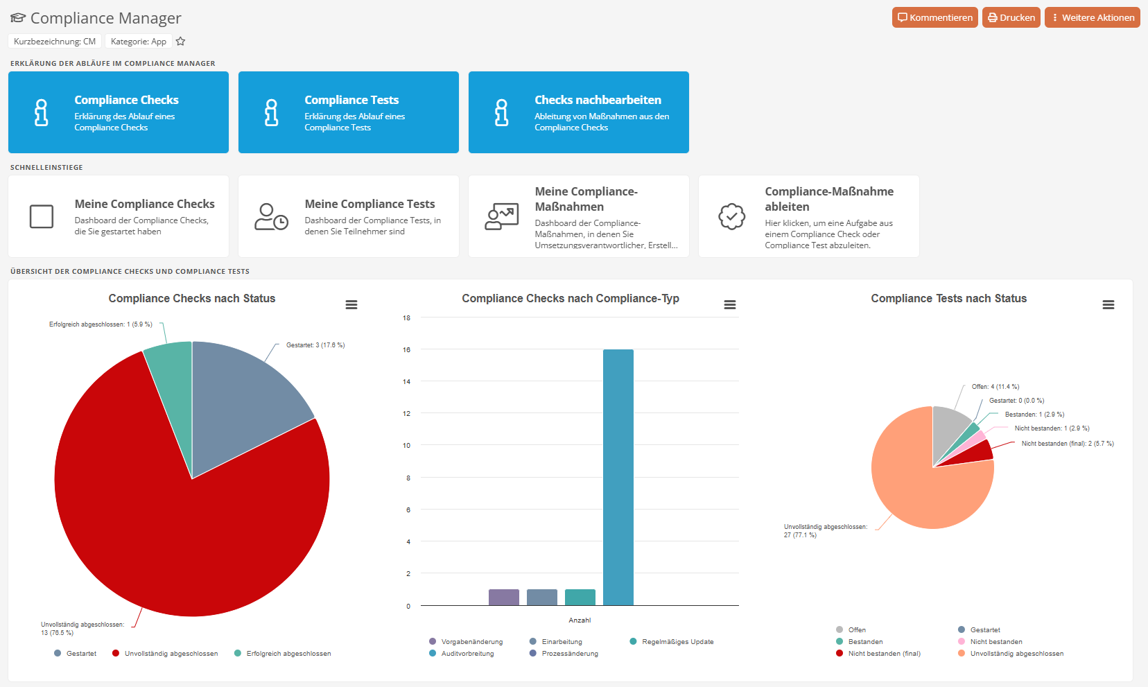 Die separate Compliance Manager App unterstützt das Management und die Prozessverantwortlichen zusätzlich dabei, alle Compliance-Aktivitäten zu analysieren und zu steuern.