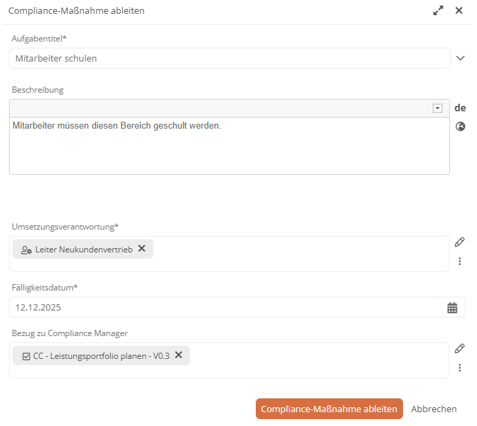 Klicken Sie im Formular auf Compliance Maßnahme ableiten