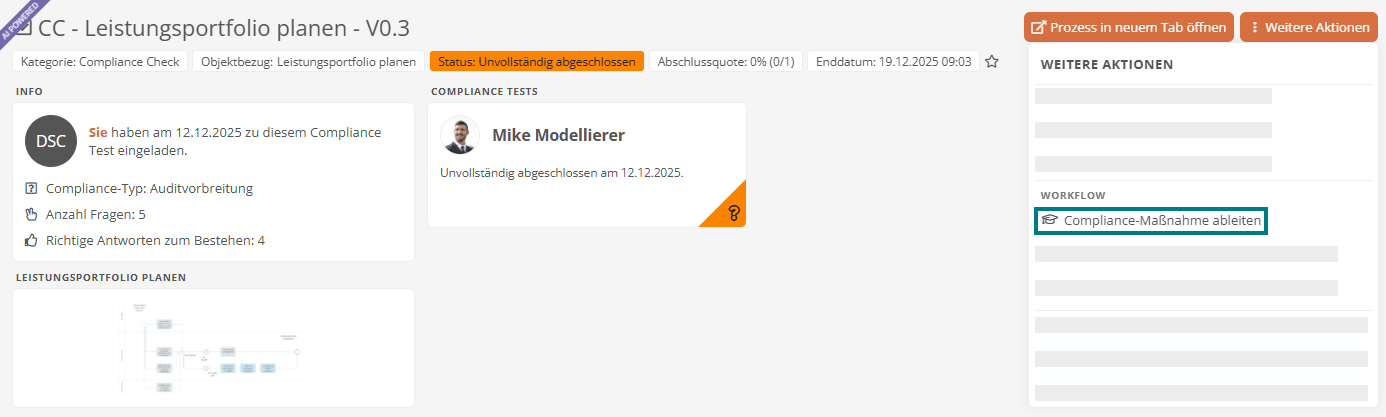 Klicken Sie in den Weiteren Aktionen eines Compliance Checks oder Tests auf die Schaltfläche Compliance-Maßnahme ableiten: