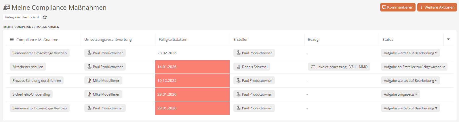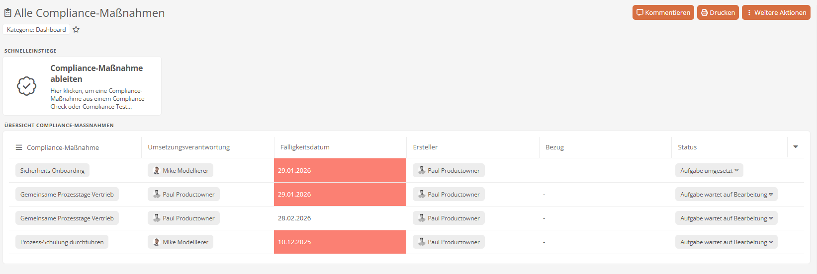 In diesem Dashboard werden alle Compliance-Maßnahmen ausgewertet. Zusätzlich können Sie entweder über die Weiteren Aktionen oder den entsprechenden Schnelleinstieg eine Compliance-Maßnahme ableiten.