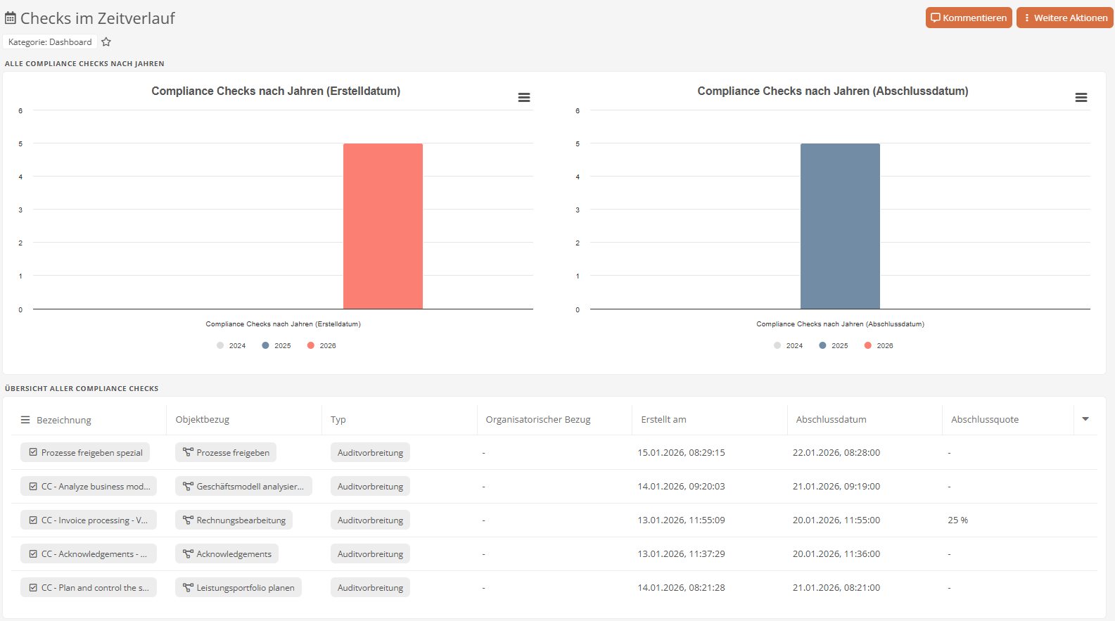 In diesem Dashboard werden Compliance Checks nach ihrem Erstell- und Abschlussdatum ausgewertet. Die Checks werden dabei in vier Balkendiagrammen visualisiert: