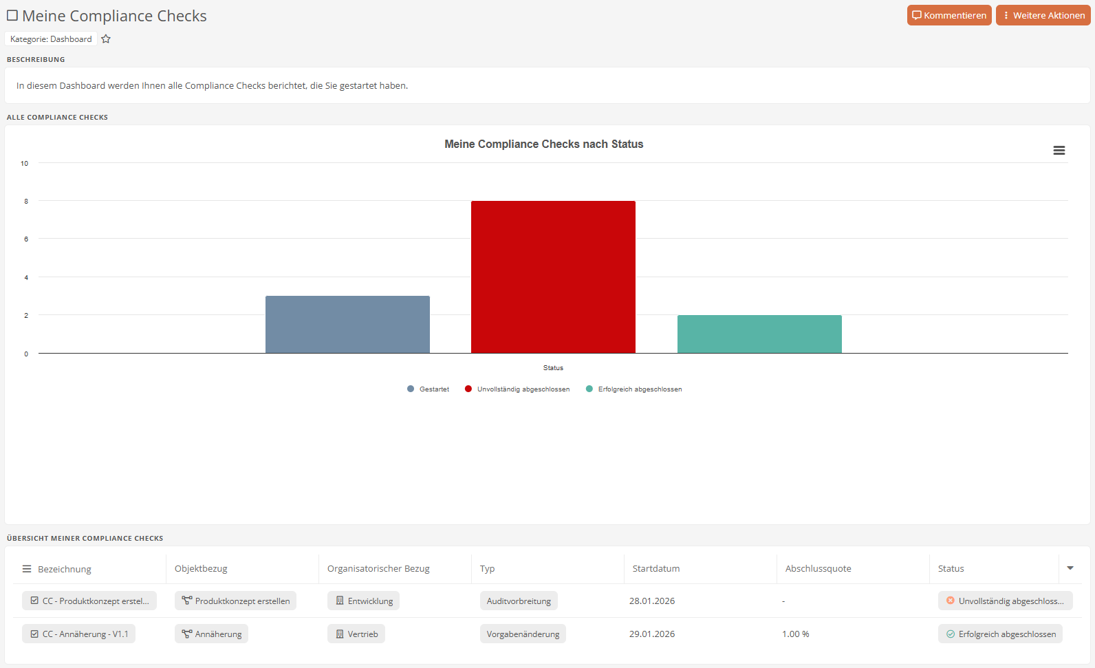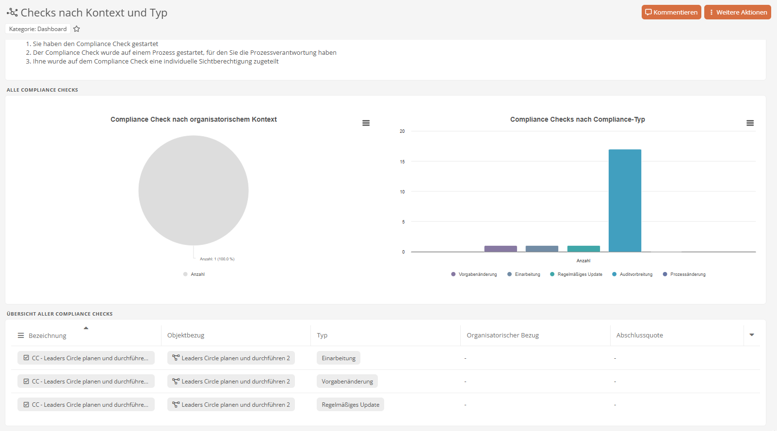 In diesem Dashboard werden alle Compliance Checks nach organisatorischem Kontext und Compliance-Typ ausgewertet.