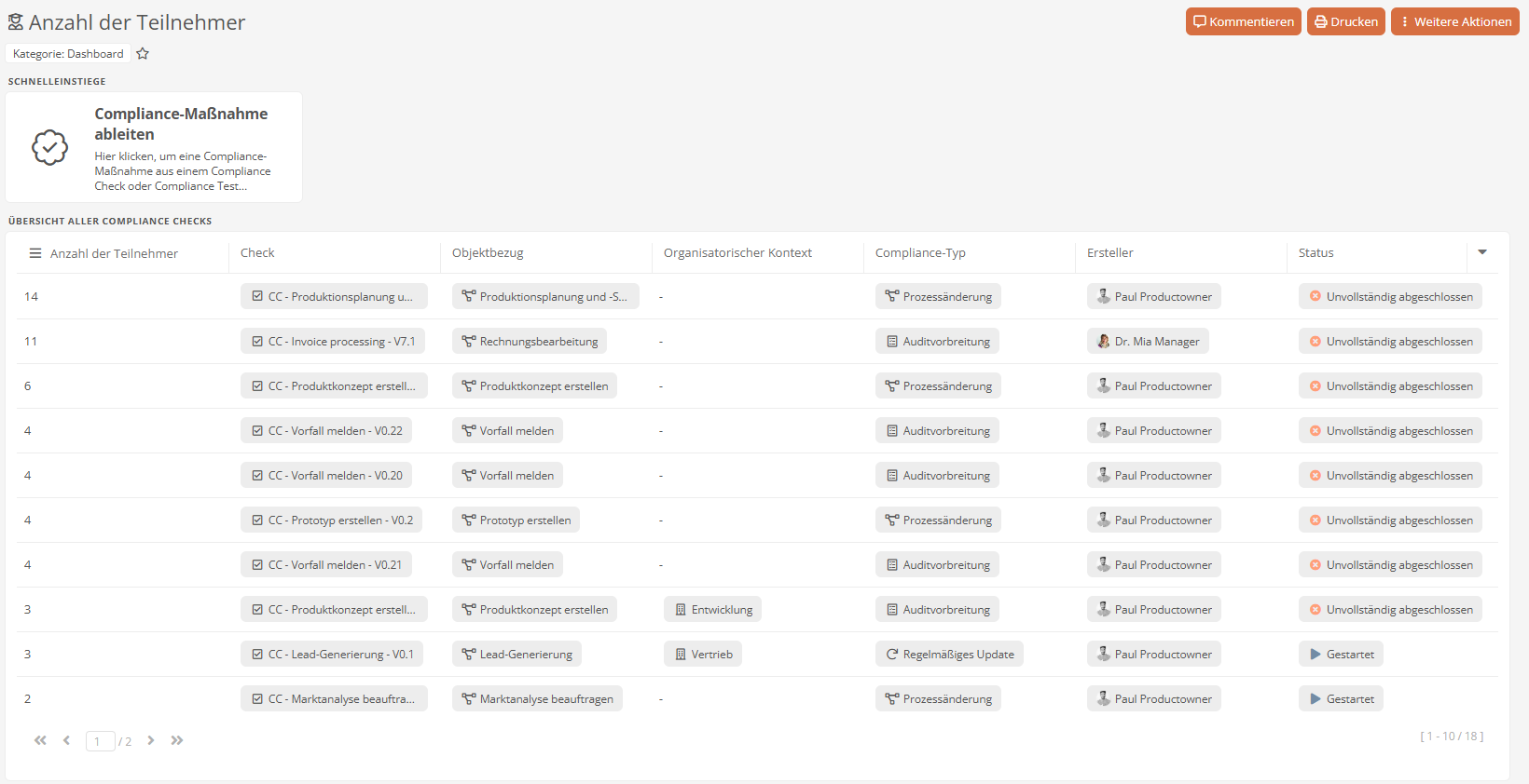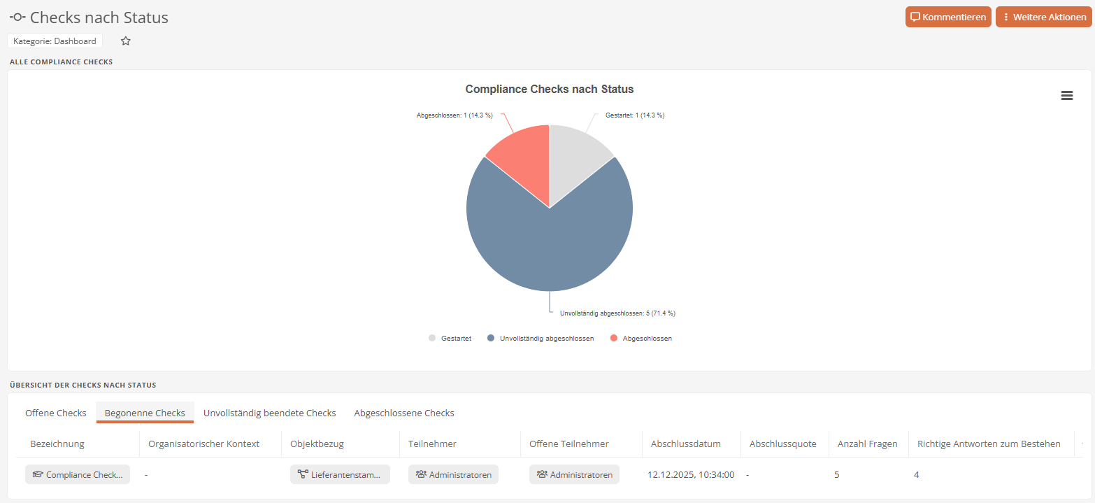In diesem Dashboard werden Compliance Checks hinsichtlich der Teilnehmerzahl ausgewertet. Zusätzlich können Sie entweder über die Weiteren Aktionen oder den entsprechenden Schnelleinstieg eine Compliance-Maßnahme ableiten.
