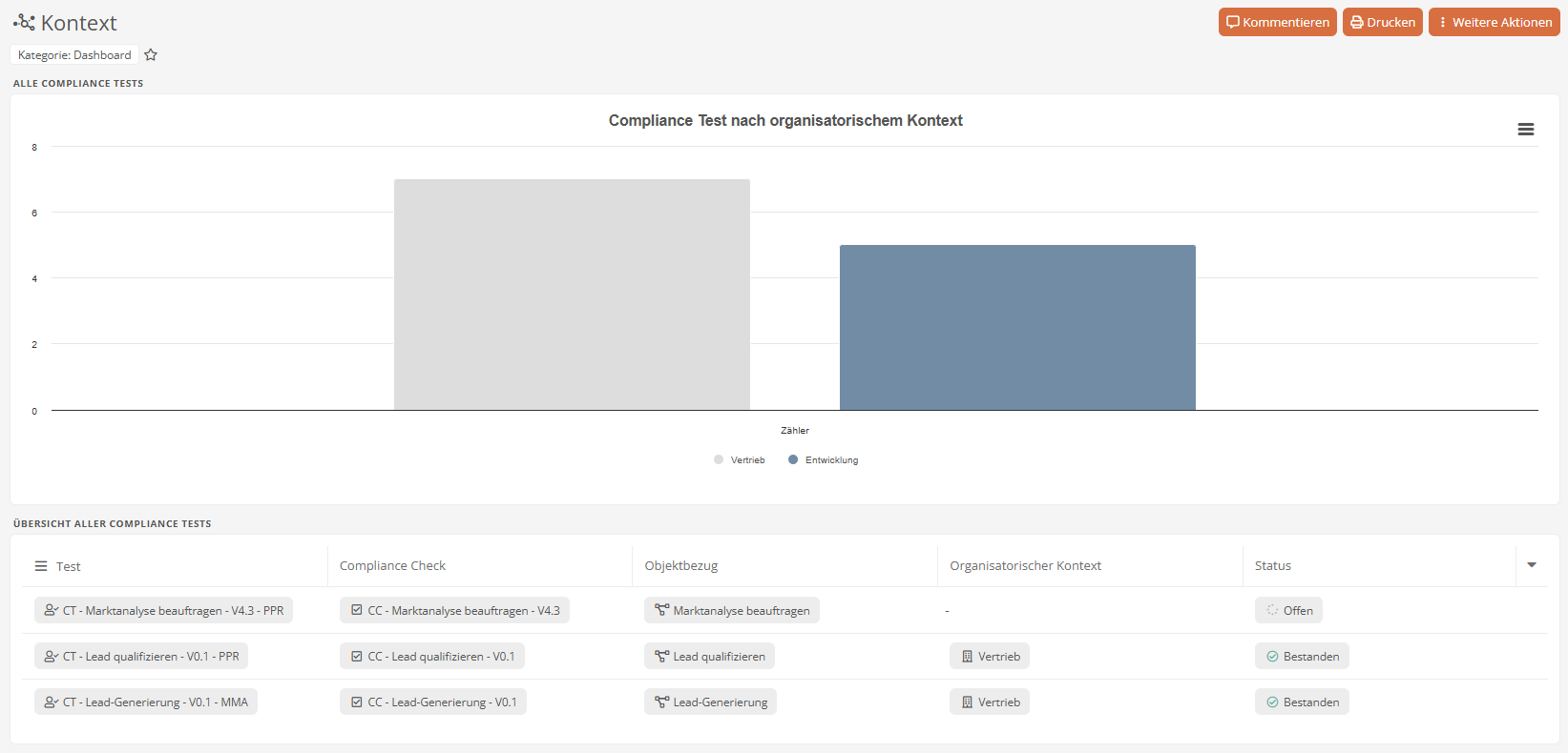 In diesem Dashboard werden alle Compliance Tests nach organisatorischem Kontext ausgewertet.