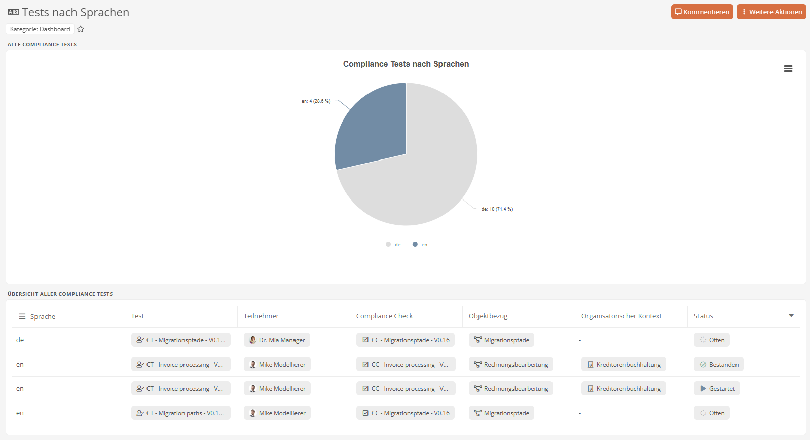 In diesem Dashboard werden Compliance Tests hinsichtlich der Sprache, in der sie generiert wurden, ausgewertet.