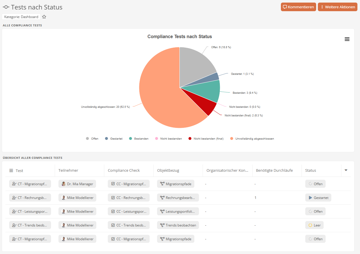 In diesem Dashboard werden alle Compliance Tests nach ihrem Status ausgewertet.