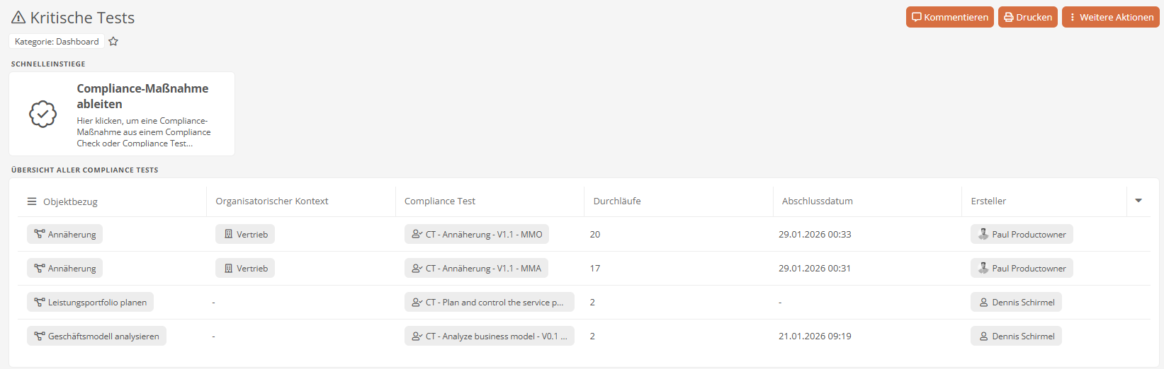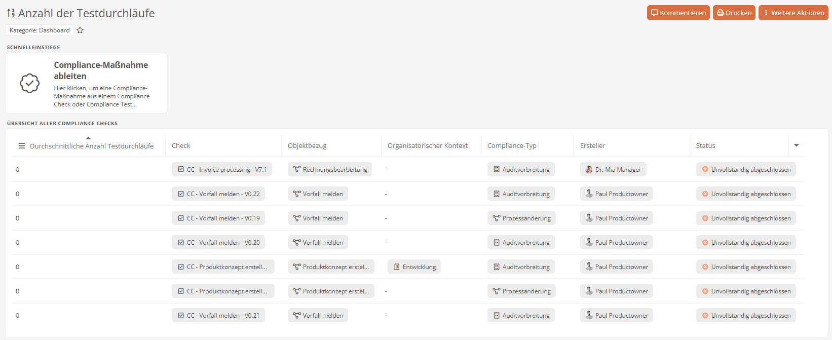 In diesem Dashboard werden Compliance Checks hinsichtlich der im Durchschnitt benötigten Testdurchläufe ausgewertet. Zusätzlich können Sie entweder über die Weiteren Aktionen oder den entsprechenden Schnelleinstieg eine Compliance-Maßnahme ableiten.