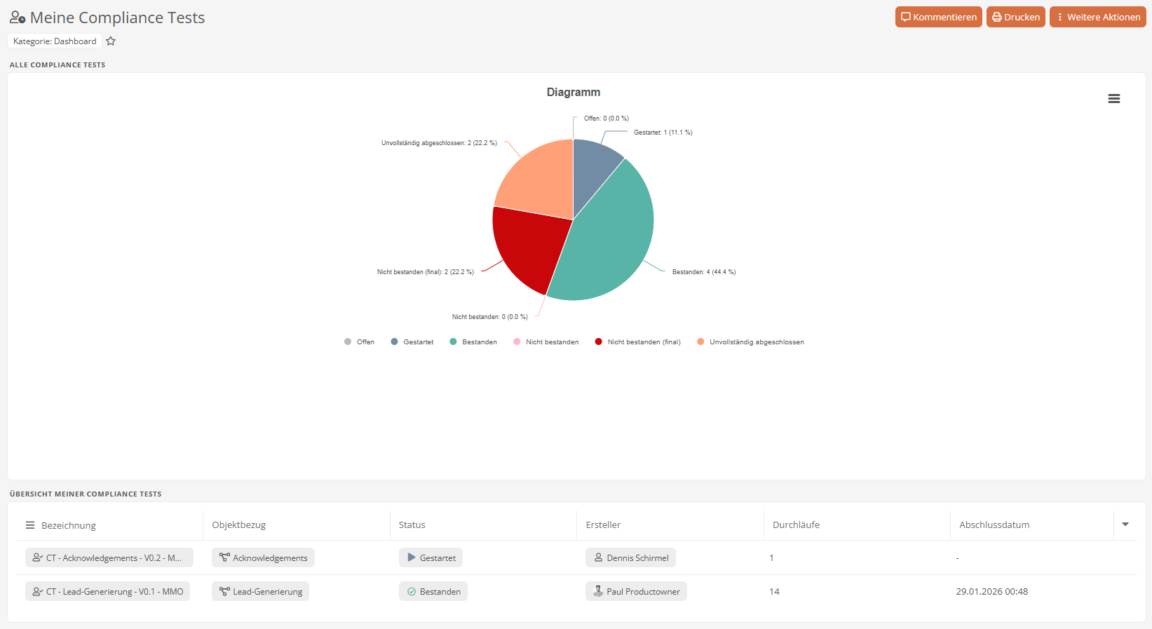 In diesem Bereich der App können Sie Compliance Checks und Tests verwalten und analysieren, in die Sie als Ersteller oder Teilnehmer involviert sind.
