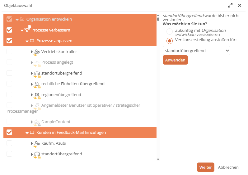 Wenn die Auswahlkomponente sichtbar ist und Sie die Versionierung über die Starttransition anstoßen, erscheint der Dialog Objektauswahl. Wenn Sie dort ein Unterobjekt auswählen, erscheint im rechten Bereich eine Abfrage, in der Sie eine der folgenden Optionen auswählen können: