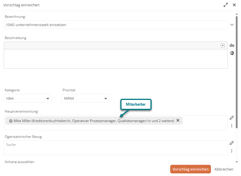 In der App Ideenmanagement können Sie Vorschläge im Attribut Hauptverantwortung standardmäßig folgenden Kategorien zuweisen: