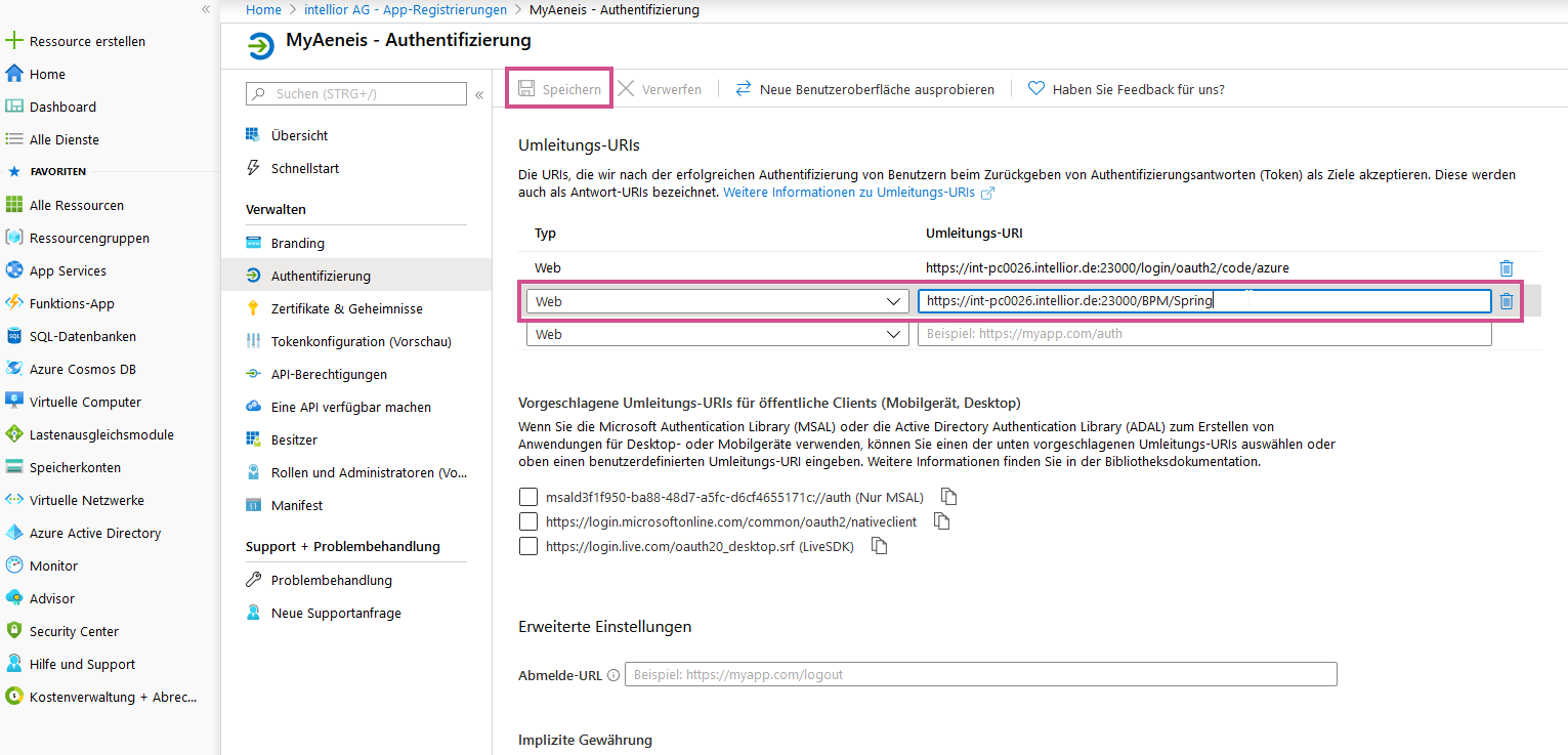 Um direkt im Microsoft-Portal das Aeneis-Portal öffnen zu können, muss der Portallink in Azure eingefügt werden. Fügen Sie hierfür in der registrierten Anwendung unter Authentifizierung den Aeneis-Portallink ein und speichern Sie: