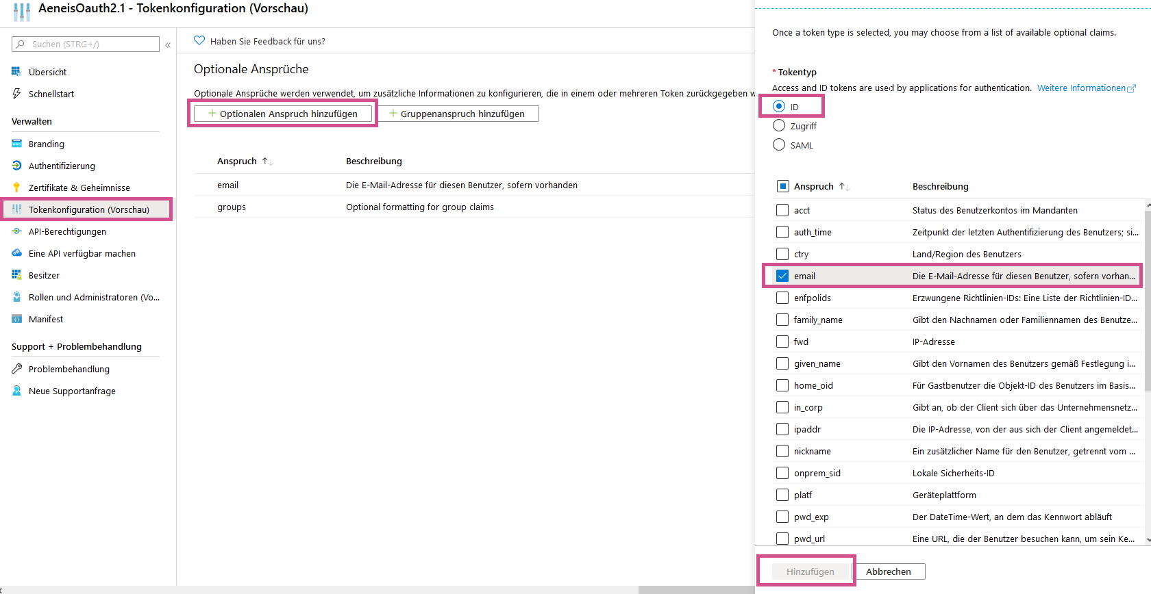 Fügen Sie in Azure in der registrierten Anwendung unter Tokenkonfiguration (Vorschau) einen Optionalen Anspruch hinzu. Fügen Sie den Tokentyp ID und Anspruch email hinzu: