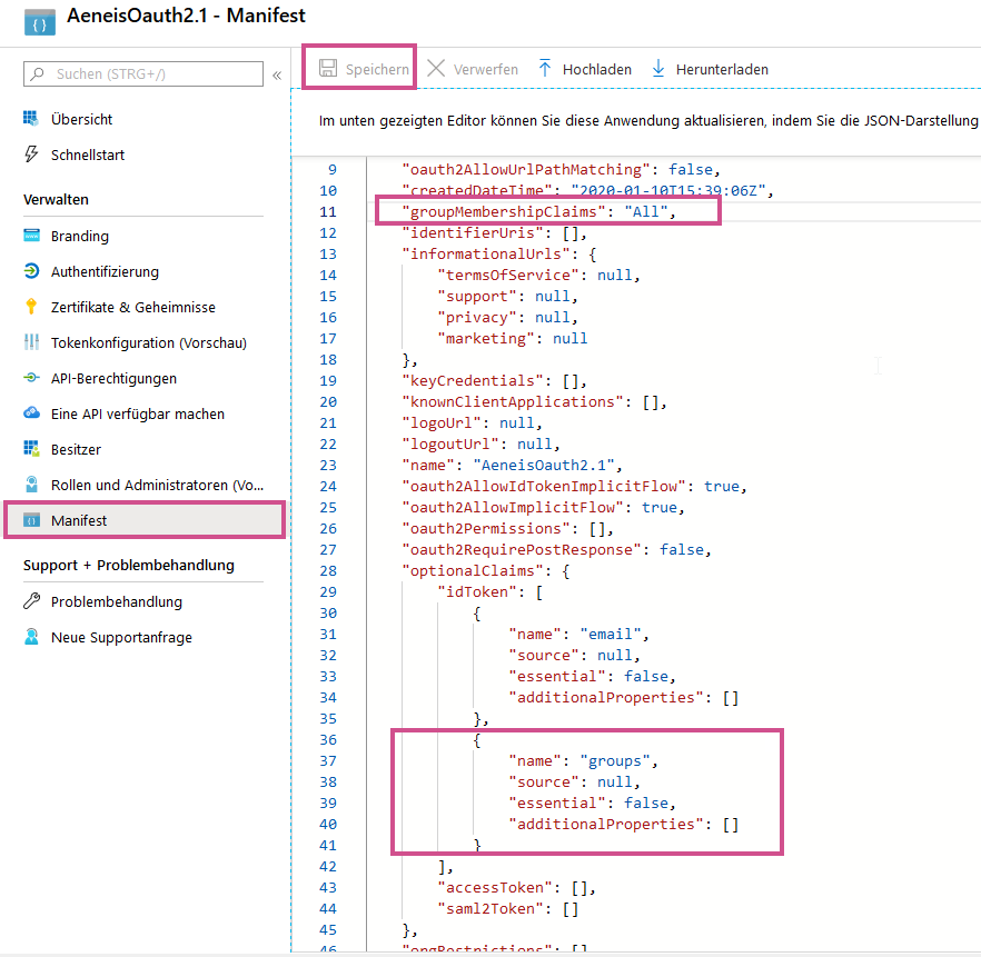 Damit die Gruppen des Benutzers über die Externe ID der Aeneis-Gruppe identifiziert werden, tragen Sie in Azure in der registrierten Anwendung unter Manifest Folgendes ein: