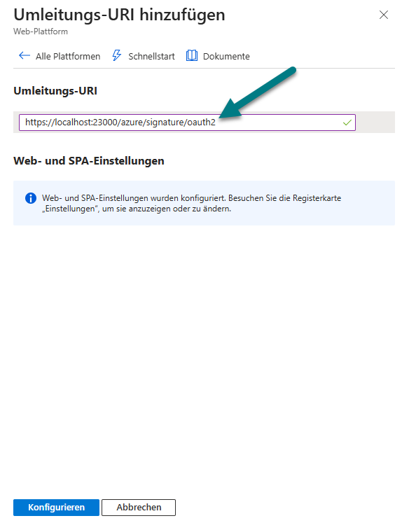 Tragen Sie die Umleitungs-URI in folgendem Format ein: https://[HOSTNAME]:[PORT]/azure/signature/oauth2