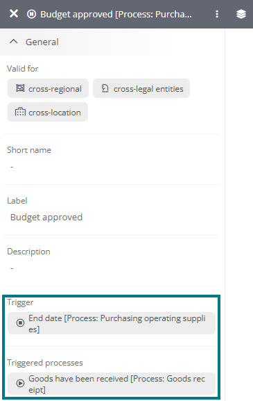 In BPMN diagrams, you can chain processes via events in order to define predecessor and successor processes. Depending on the event type, the properties Trigger and/or Triggered processes are available for this.