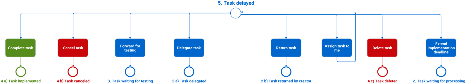 In the Task delayed status, the same transitions can be executed as in the Task waiting for processing status. In addition, the creator can execute the transition Extend implementation deadline. This returns the task to the Task waiting for processing status until the new due date, and those responsible for implementation are notified by email.